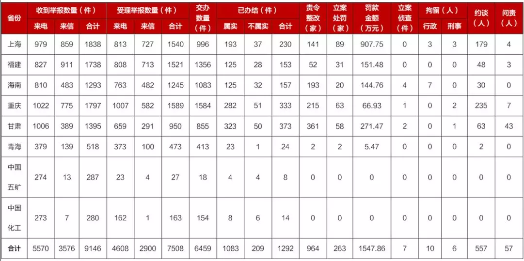 截至7月25日晚20:00,各督察组共收到群众来电、来信举报9146件,受理有效举报7508件,经梳理合并重复举报,累计向被督察地方和中央企业转办6459件;被督察地方和中央企业已完成查处1292件,其中立案处罚263家,罚款1547.86万元;立案侦查7件,拘留16人;约谈党政领导干部557人,问责57人。