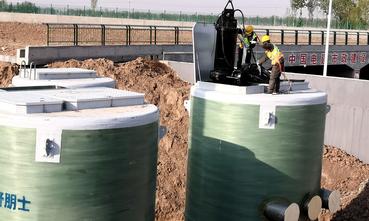 该项目设计采用三个井筒,包含一个直径3米,高13米格栅井筒和两个水泵井筒,井筒之间用管路连接,每个泵筒内安装三台水泵。格栅井进水口设置了粉碎型格栅,用于粉碎雨水中大的杂物之后分流到两个泵站中。