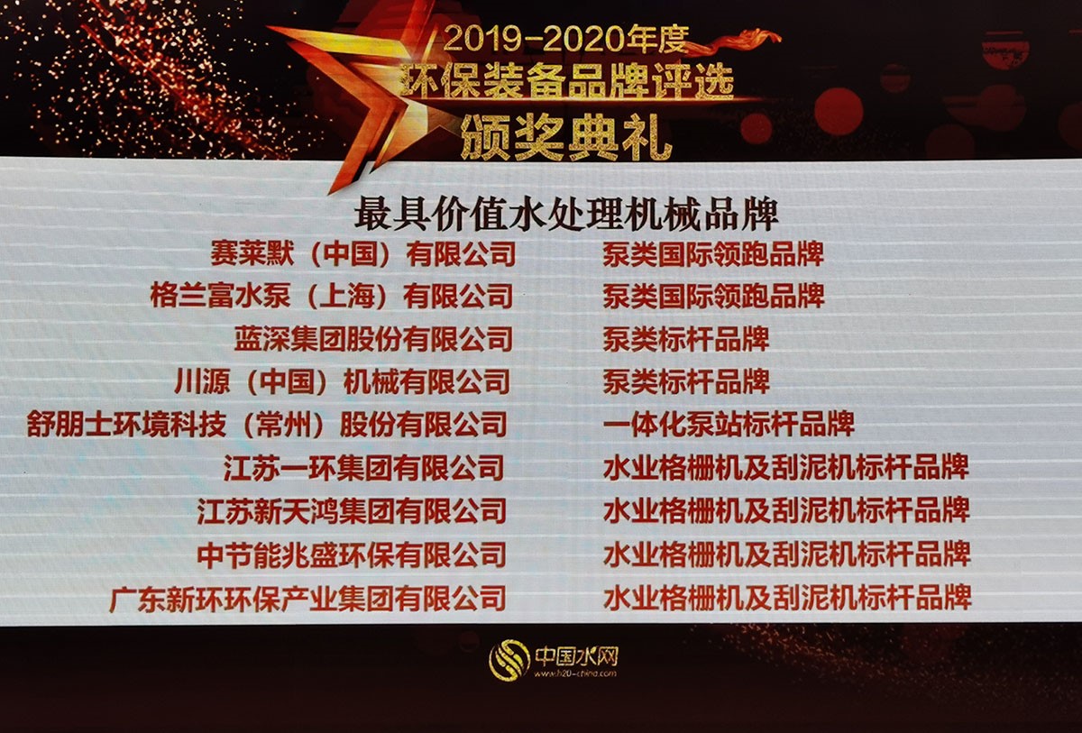 舒朋士环境科技(常州)股份有限公司荣获2020(第十二届)上海水业热点论坛“一体化泵站标杆品牌”。